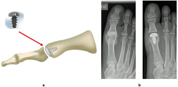 b Korrektur einer schweren Hallux valgus Fehlstellung mit luxierten Krallenzehen und chronischer Metatarsalgie durch eine Lapidus Arthrodese. Mit dieser Technik können selbst hochgradige Fehlstellungen begradigt werden. Bei beiden Techniken wird der Knochen wird mit einer winkelstabilen Platte fixiert. Dies bietet ein höchstes Maß an Stabilität und ermöglicht die sofortige postoperative Belastung.