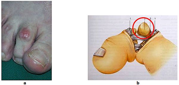 Abb.9: a Fixierte Krallenzehenfehlstellung mit Clavus (Hühnerauge).